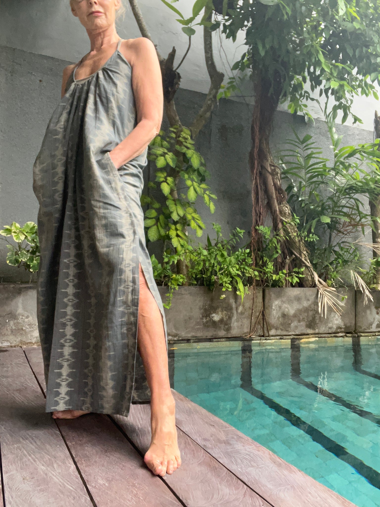 Luxurious 100% Linen Dress with Hand Stitched Flattering Neckline is one of the most Versatile Signature Styles. With thin adjustable straps and detailing in the back, fabulous gatherings and curved overlapping side slits, slightly shorter front than back and deep pockets makes this dress a Favorite Wardrobe Staple.